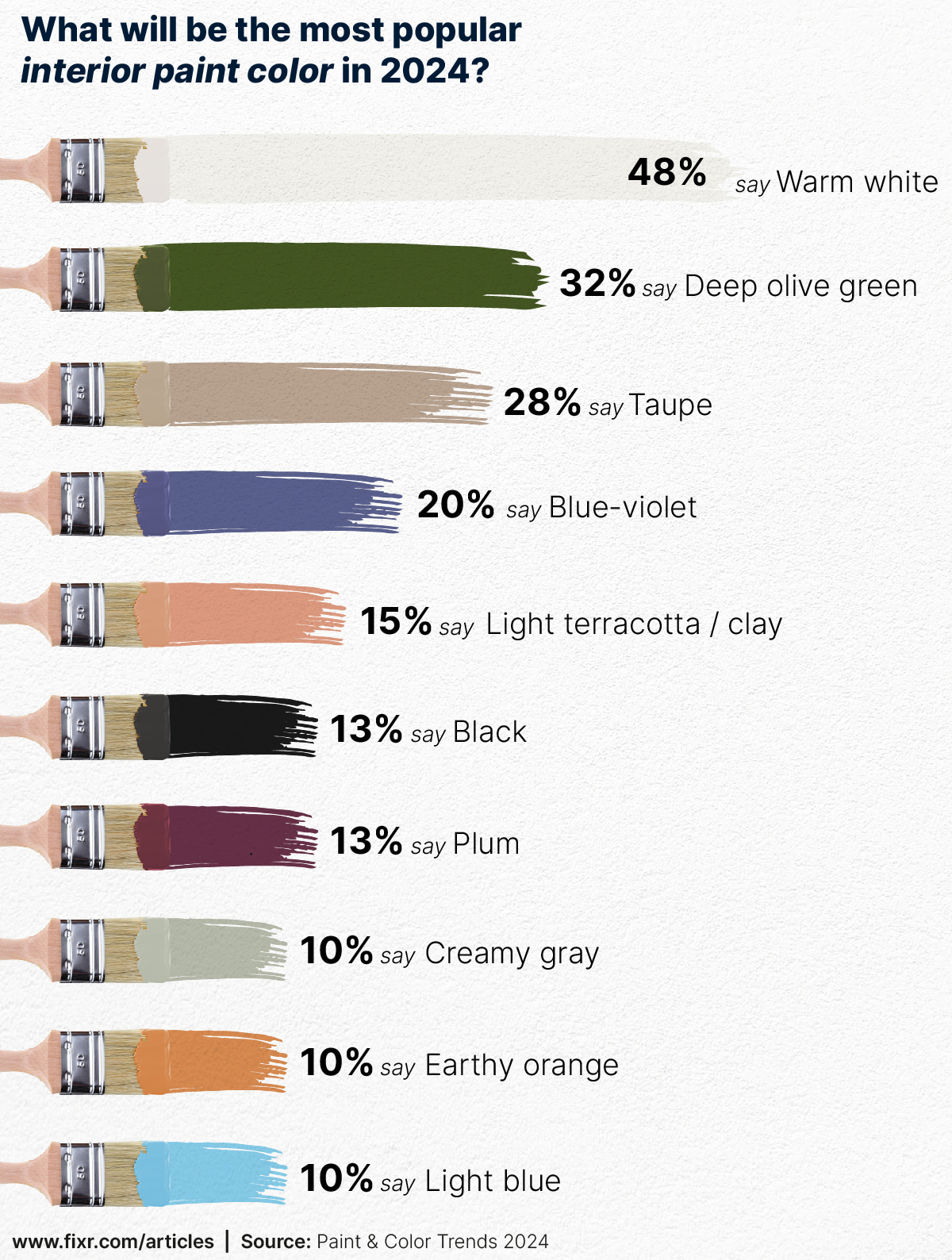 The individual colors of the year chosen by Fixr.com's top experts match the most favorable color palettes accordingly. 48% opt for the neutral color of warm white as the most popular interior paint color in 2024. This is followed by the earthy tone of deep olive green with 32%.