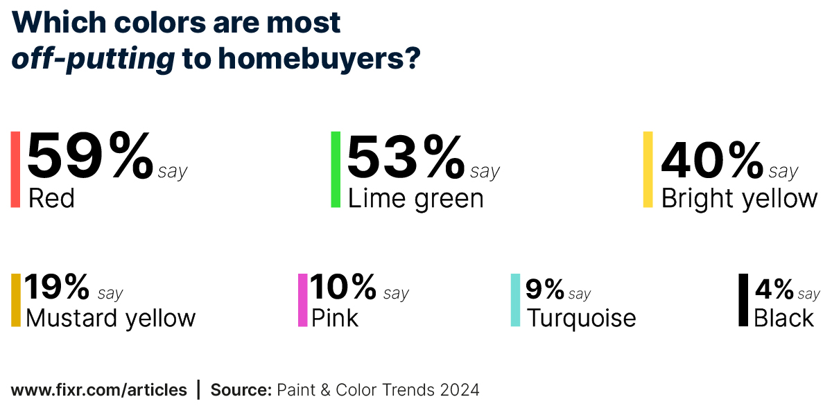 Other colors that experts believe will be detrimental to selling a home are mustard yellow (19%), pink (10%), despite the recent Barbiecore trend, turquoise (9%), and black (4%).