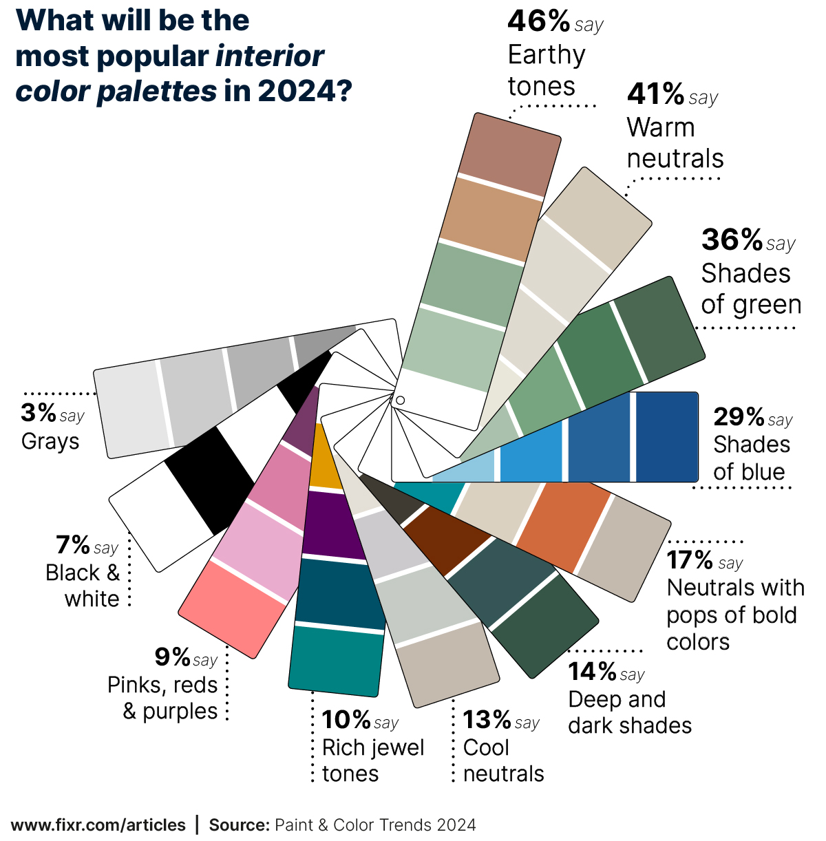 17% selected neutrals with pops of bold as the most popular palette in 2024. In Fixr.com’s 2023 report, neutrals with pops of bold were the most popular, with 58% of experts agreeing, highlighting its dramatic drop out of favor this year compared to other color palettes.