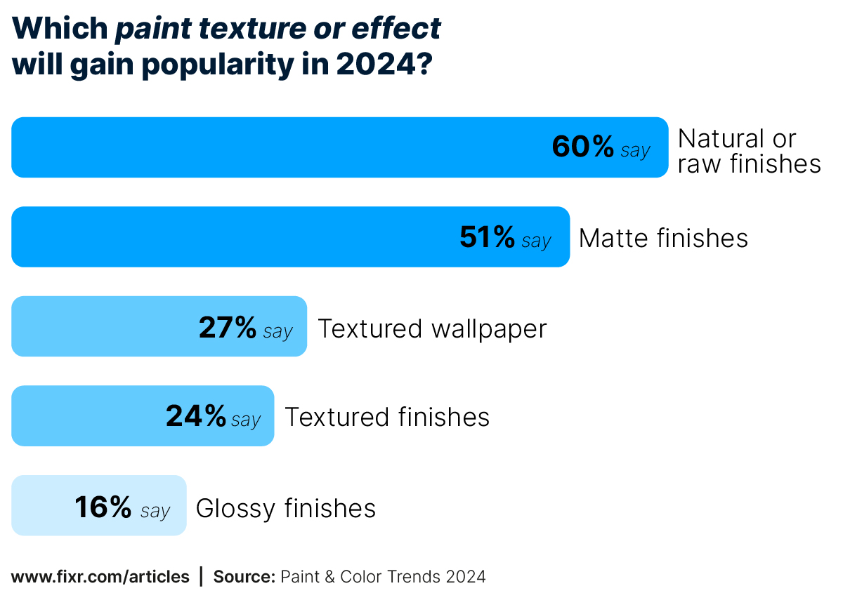 Choosing a color for your home is only one step in the design process. The type of texture or finish you decide upon will also impact the final look. 60% of design pros say that natural or raw finishes will gain the most popularity in 2024. Natural or raw finishes usually refer to a type of paint finish that is made from natural ingredients. They are more environmentally friendly and carry less toxic chemicals.