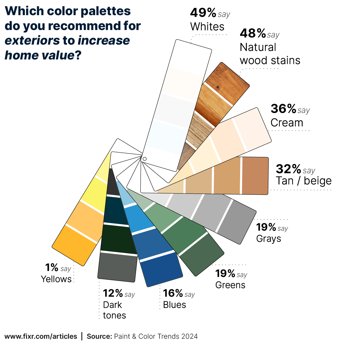 - Whites are the best color for exteriors when selling a home, say 49% of top experts.