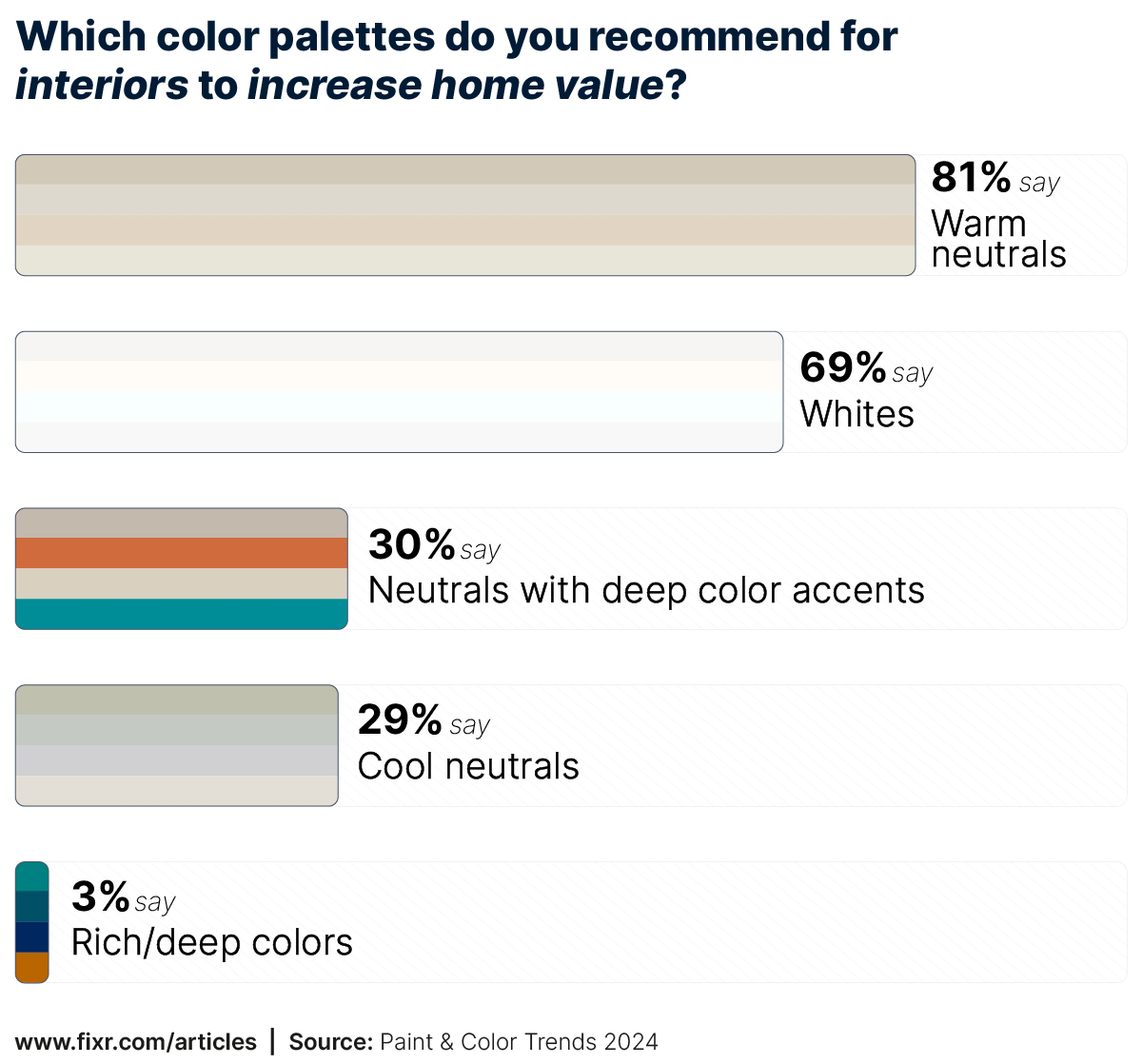 Only 30% of experts recommend neutrals with deep color accents. While from a design viewpoint, an accent wall can add a lot to a room, knowing where and which color works best is probably best left to professionals. 29% advise using cool neutral colors to increase home value, and only 3% say to paint the home rich/deep colors.