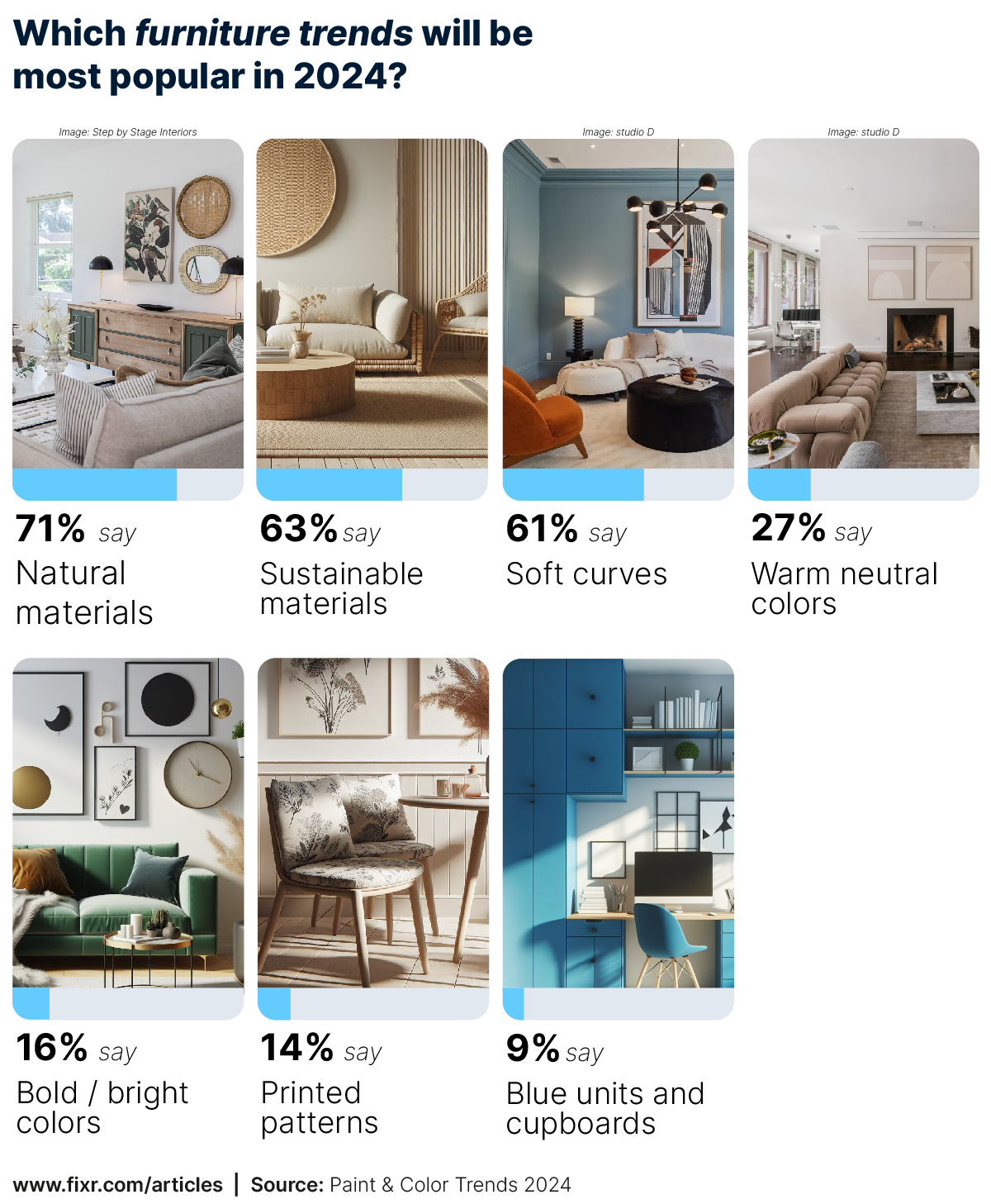 61% of pros believe soft curves will be the biggest furniture trend this year. 27% say that warm neutral-colored furniture will dominate, while 16% claim that most people seek bold and bright colored furniture.