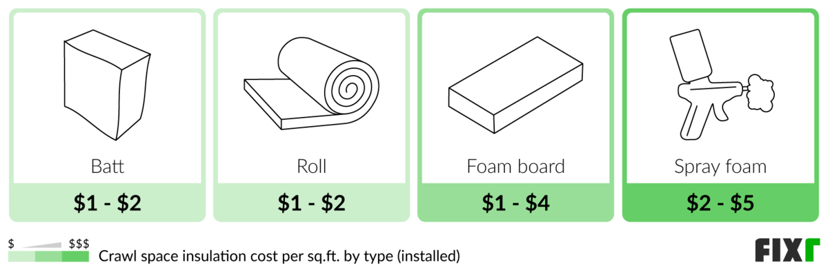 Crawl space insulation costs vary by the type of insulation. Contractors can recommend the best type of insulation for your home design and climate because some insulating materials are better at preventing heat loss or moisture buildup than others. While batt, roll, foam board, and spray foam are recommended for crawl spaces, blown-in insulation is not due to the tight space. The table below shows the average cost per square foot to install different types of crawl space insulation.
