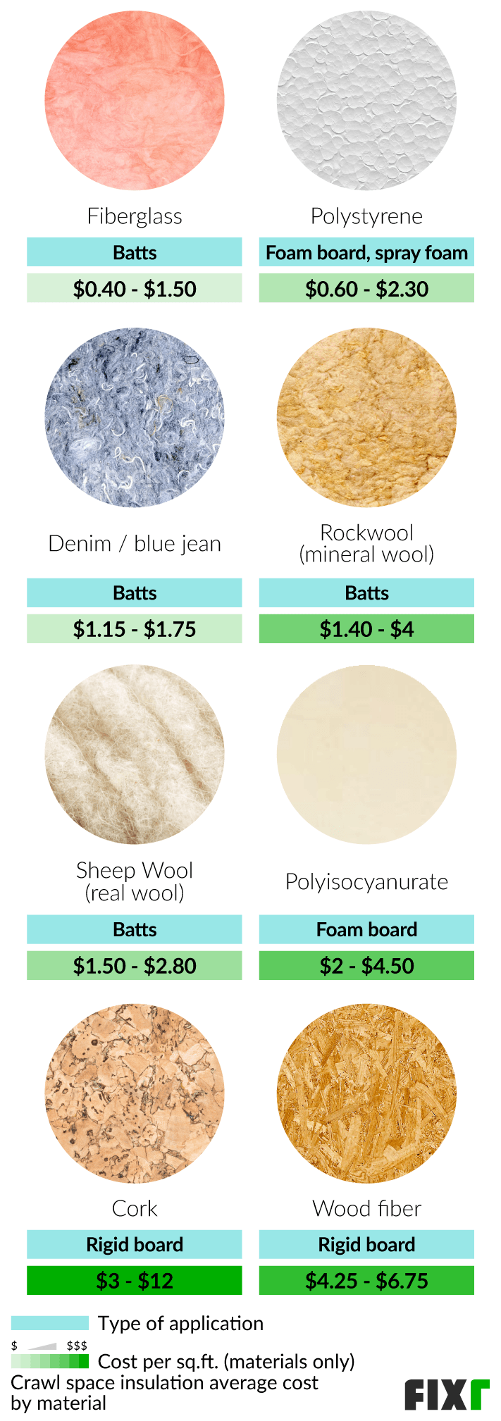 Many materials are used to insulate homes and buildings, but some are unsuitable for dark, cramped crawl spaces. Suitable crawl space insulation materials come in several applications, such as crawl space fiberglass insulation or rockwool insulation, which is supplied in batts. These materials are often combined with polyisocyanurate or polystyrene spray foam or rigid foam board for optimal warmth and performance of crawl space insulation. Denim/blue jean, rockwool, and sheep wool also come in batts. This makes them easy to install but not quite as effective as foam-based insulation, which provides an air barrier. Cork and wood fiber rigid boards offer a high level of insulation and moisture protection. The below table outlines different crawl space insulation materials, application type, and average costs per square foot.