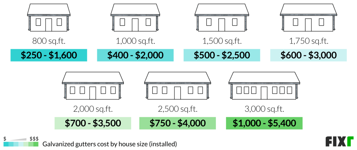 Your home size can impact the total amount of gutters needed. While your roof shape and pitch can influence how much guttering you need, the larger your home, the more gutters you need. House interior square footage does not always match the roof size or gutter requirements. You may need a range of gutter lengths, depending on the location, roof shape, and exterior wall length. Below are the average costs to install galvanized steel gutters on homes of various sizes, using the most common gutter lengths for each.