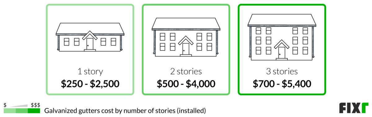 Below are the average costs to install galvanized steel gutters on homes of 1, 2, and 3 stories, assuming a 1-story home is between 800 and 1,500 sq.ft, a 2-story home ranges from 1,500 and 2,500 sq.ft., and a 3-story home is between 2,000 and 3,000 sq.ft. Your home may fall outside these measurements, impacting your final cost.