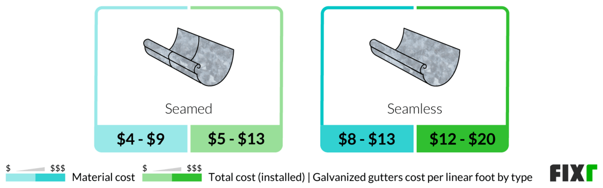The average cost for galvanized gutters ranges between $4 and $13 per linear foot, for the material, and $5 to $20 a linear foot installed, depending on the type. Galvanized steel gutters are divided into two types: seamed and seamless. Seamed gutters have visible lines where multiple pieces are attached. Seamless styles are one continuous piece without seams or joints. The table below shows the average cost for each.