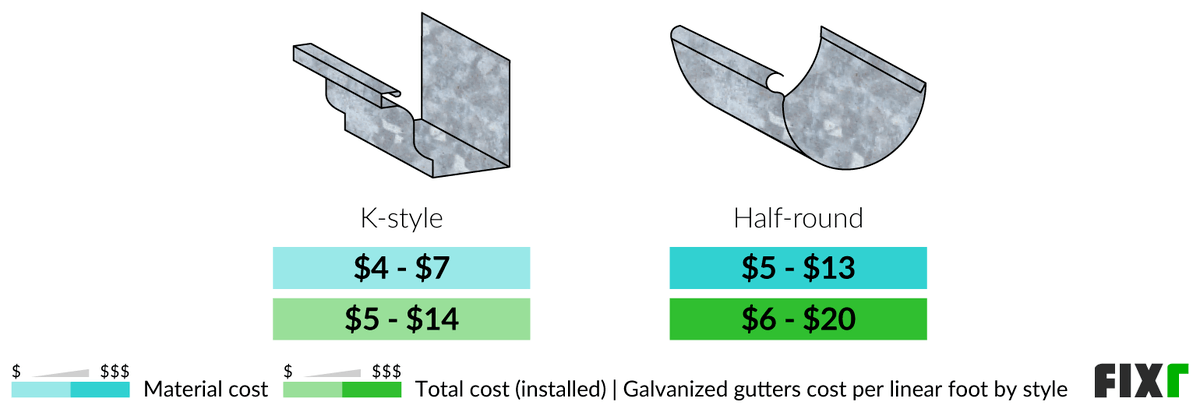 The average cost for galvanized gutters ranges from $4 to $13 per linear foot for materials, depending on the style. Galvanized steel gutters are divided into two main styles: half round and box. While they perform the same function, these types differ in appearance, style, cost, pros, and cons. The table below highlights the average cost of each, followed by a subsection explaining each type.