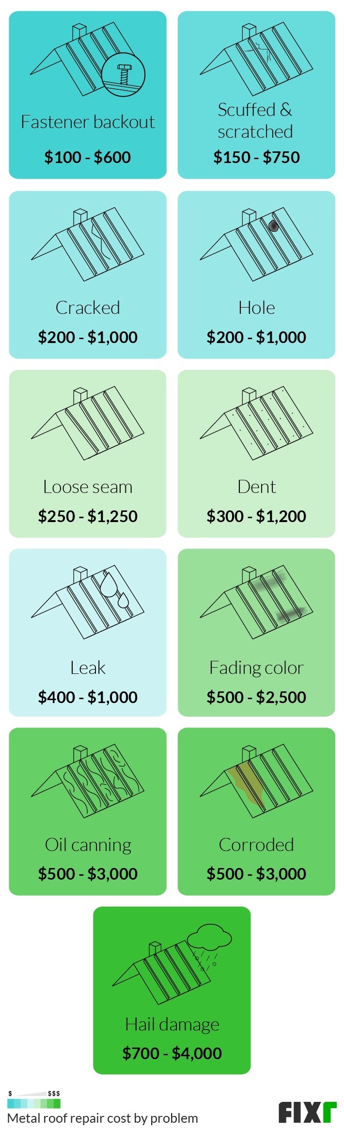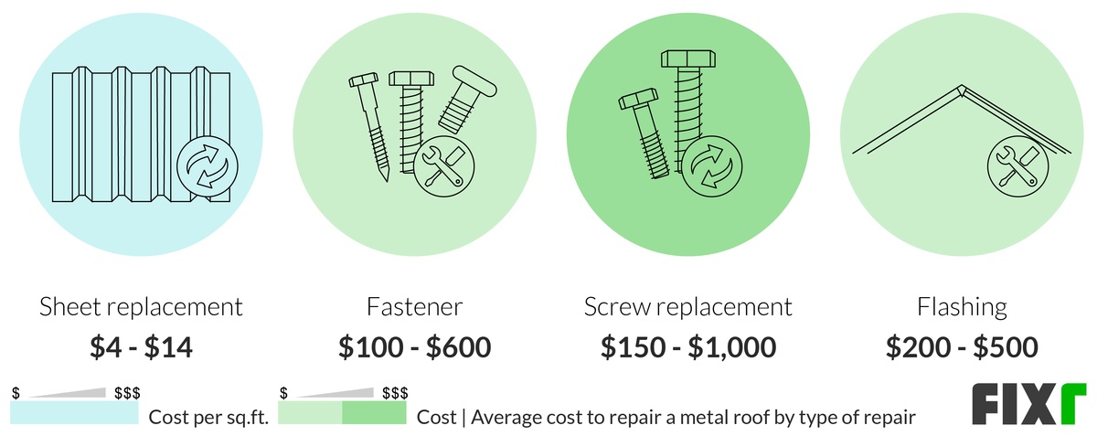 To repair fasteners backing out on a metal roof, expect to spend $100 to $600. Fasteners may come loose and back out of sections of a metal roof. The fasteners can be reused if they are not damaged, and a repair worker can put them back in their positions, tighten them, and apply a sealant.